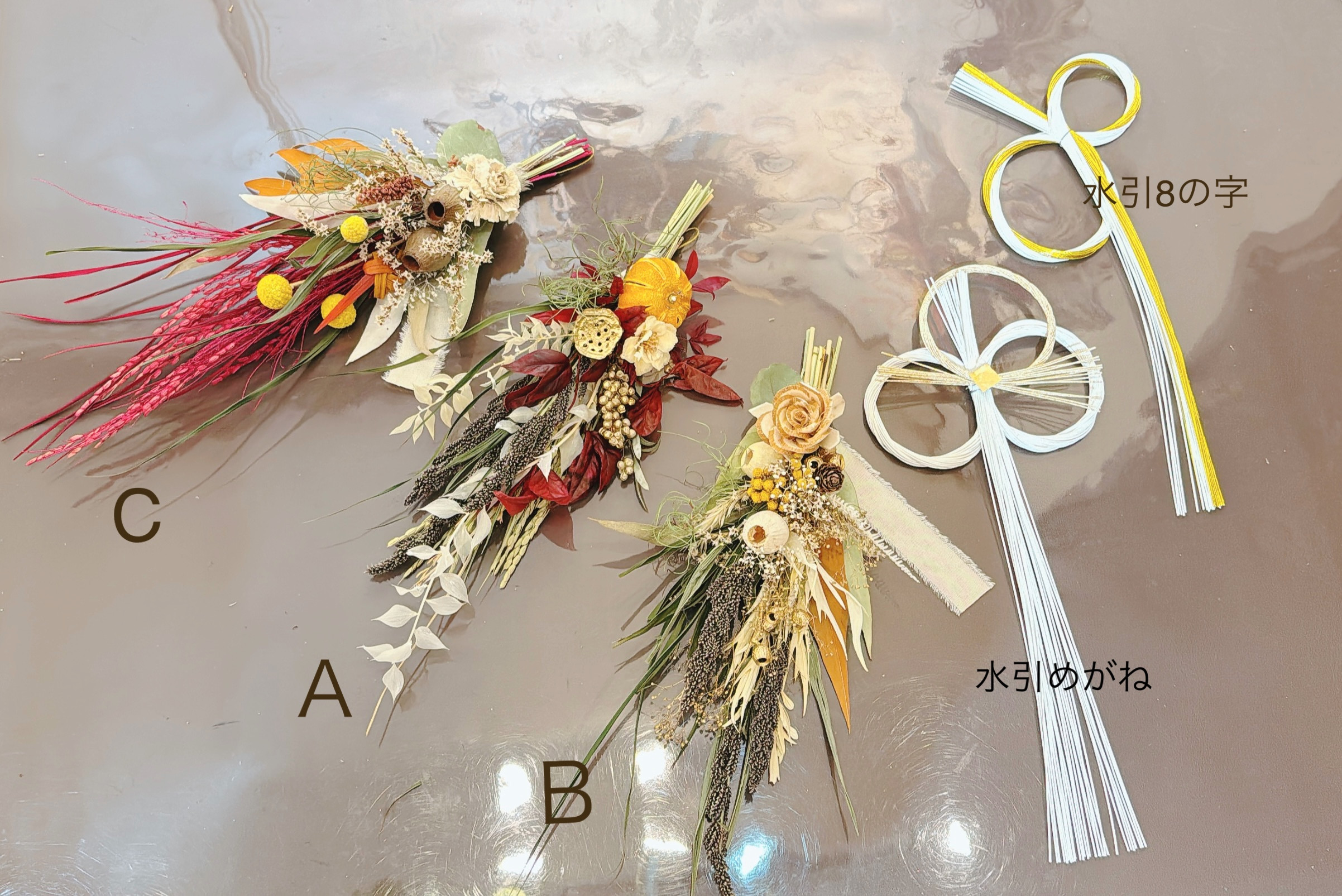 和スワッグ花の組み合わせは3パターンご用意しました。