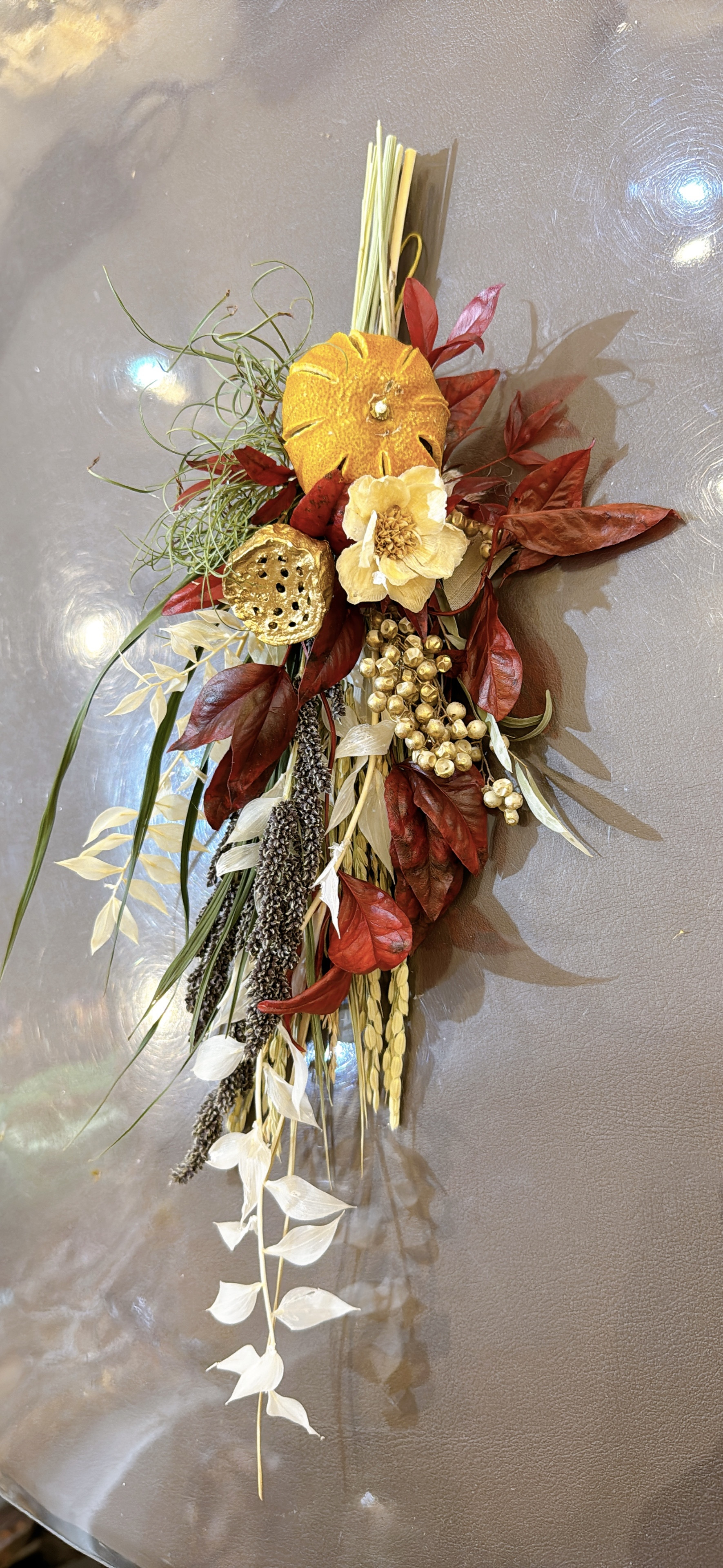 紅葉した南天のプリザーブドに、ゴールドのハスの実や、ベージュのアネモネ、ゴールドペイントのペッパーベリー、柑橘が香る橙の色合いに黒ひえや、稲穂のグラミネのナチュラルな雰囲気が加わります