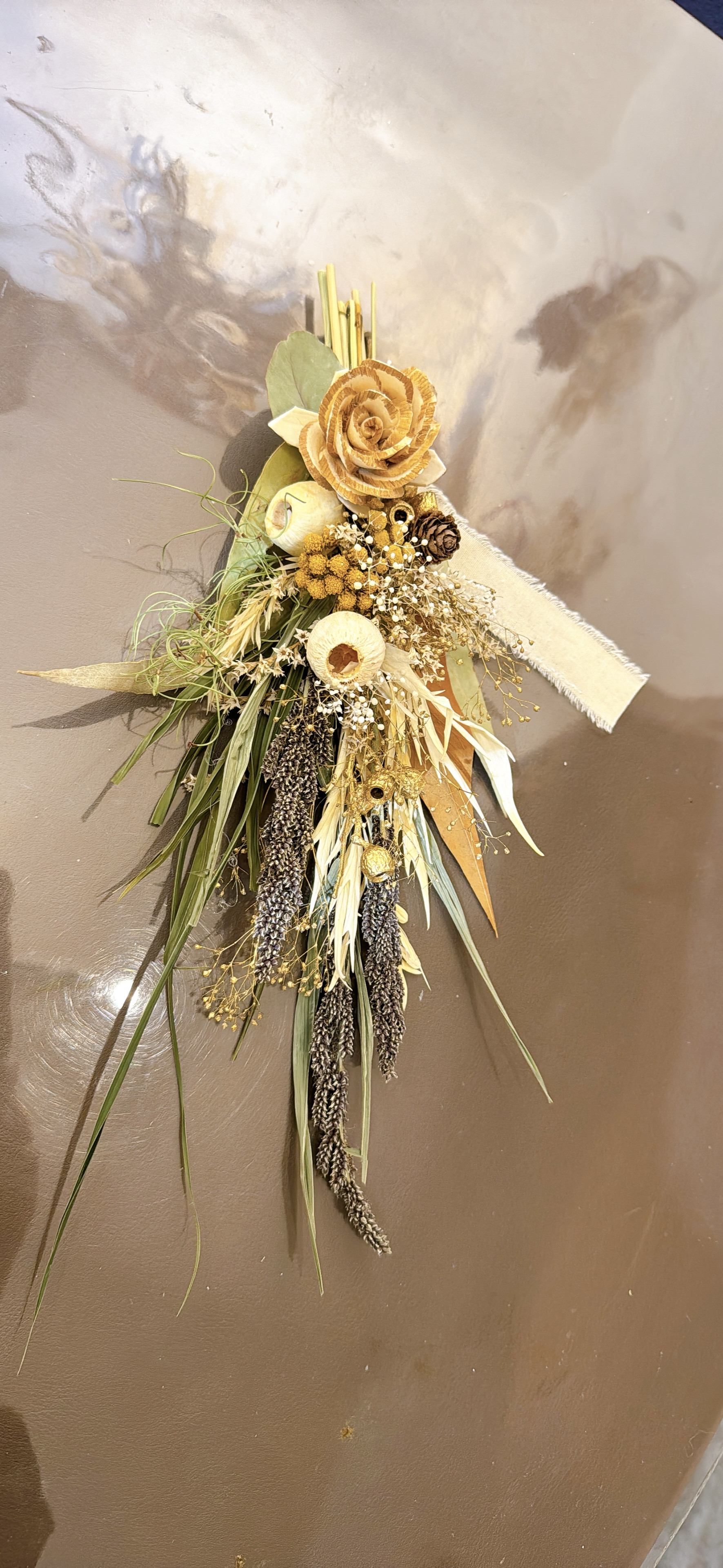ソラフラワーのロータスローズに、サラシのガンベルズ、ゴールドのアーバンナッツ、黒ひえ、ゴールドやアイボリーの霞草、橙のローナス、アイボリーのグレビリアロブスタのプリザーブド等が華やかではあるけれどナチュラルに彩ります