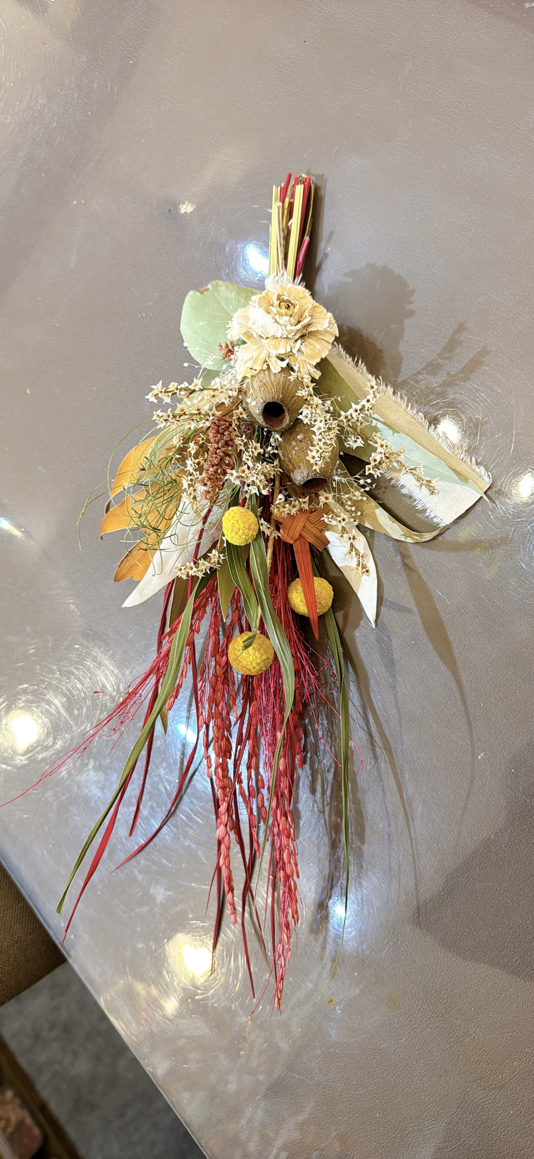 シックなアイボリーベージュのシダーローズやナチュラルなガンベルズ、橙のビリーボタンに、赤い稲穂や、コキアが華やかに彩りを加えてくれます