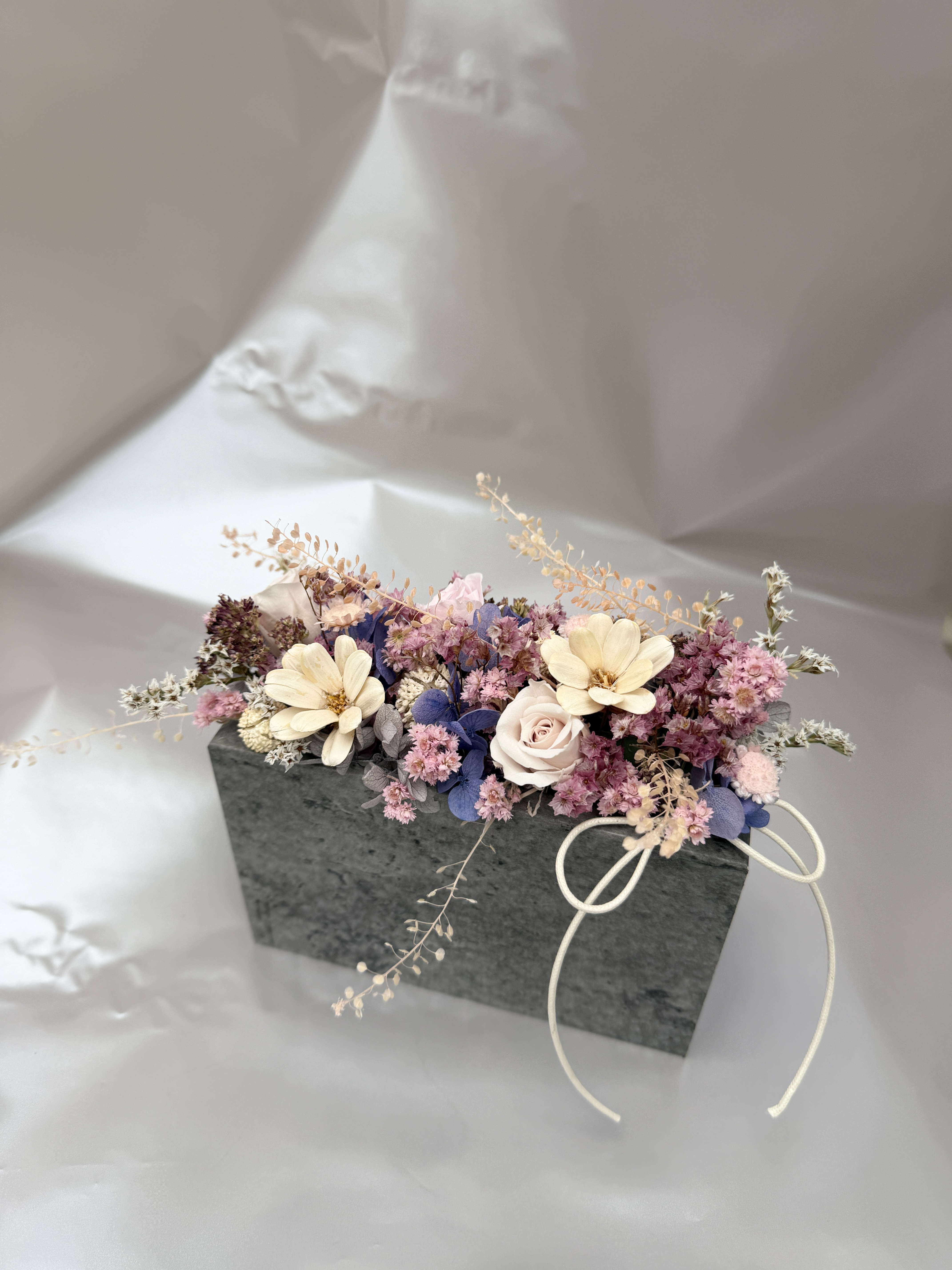 淡いスノーピンクのプリザーブドローズやドライパープルの花材を中心に、ナチュラルでどこか都会的な春の雰囲気を楽しみながら制作します。